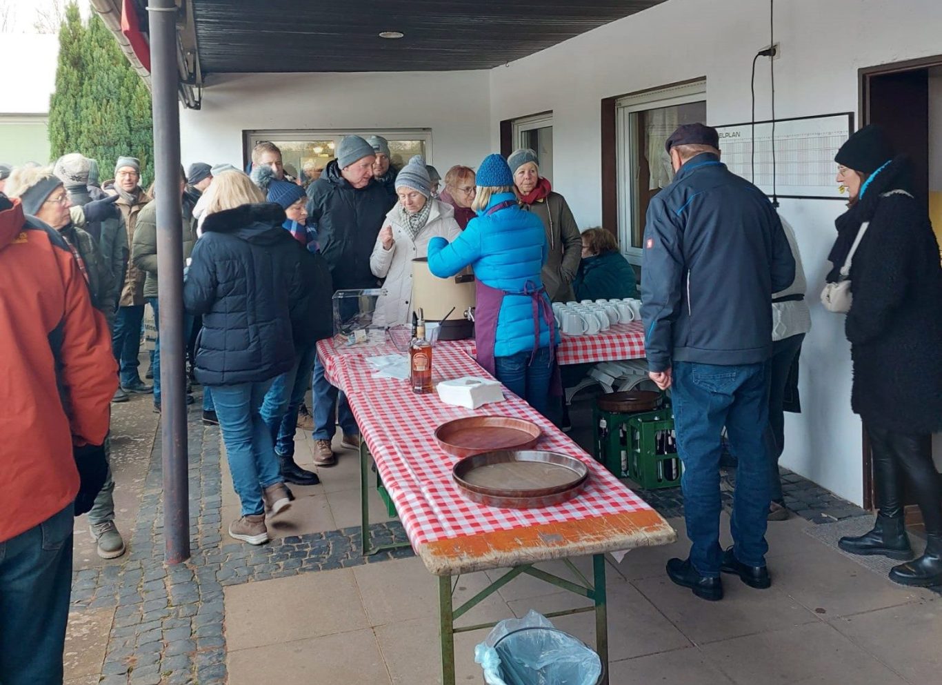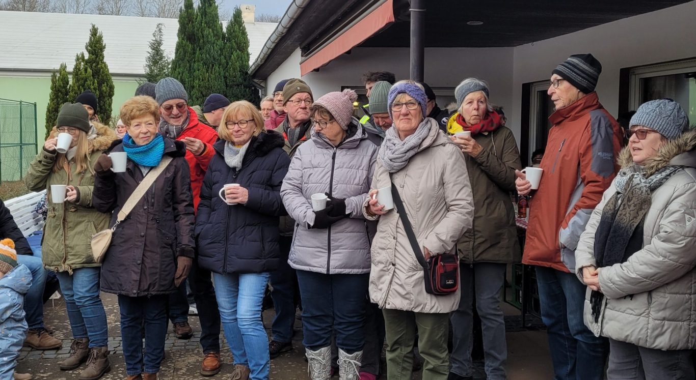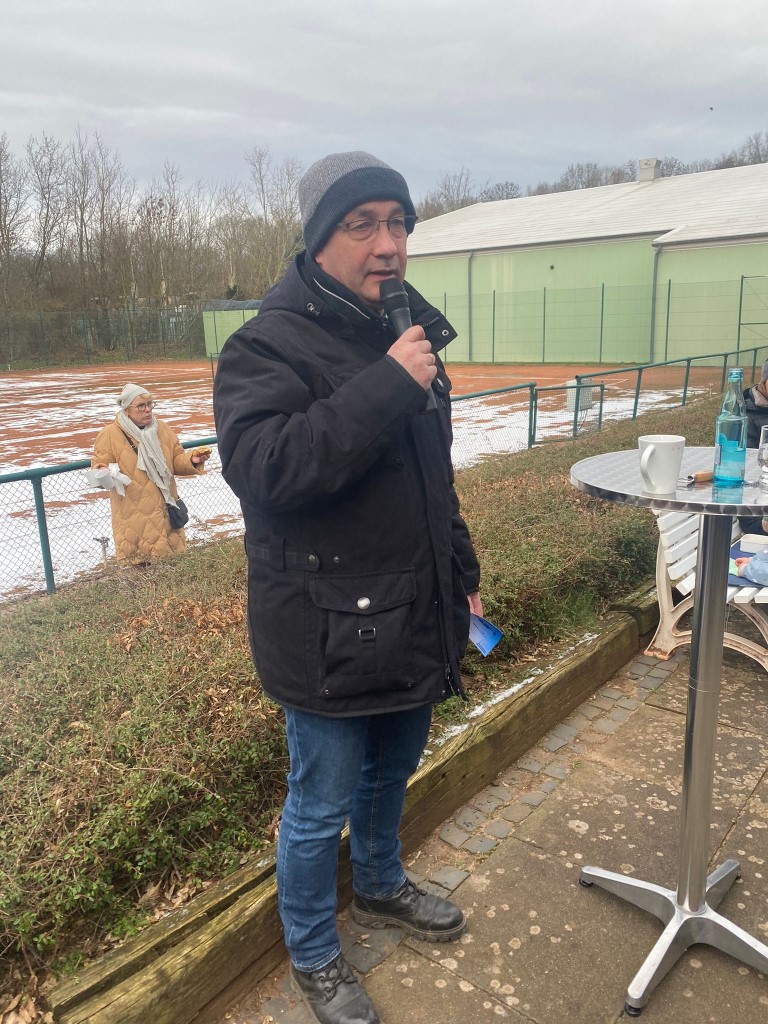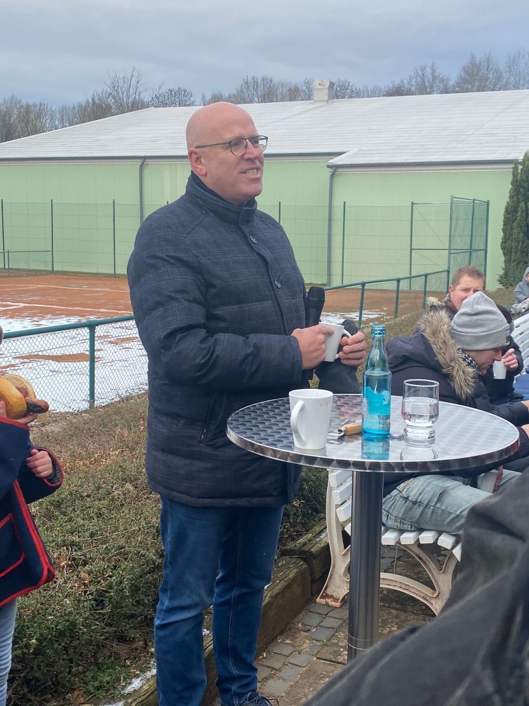 Neujahrsempfang der Vereine beim TV Stolzenau 150 Personen, so viel wie noch nie, hatten sich zu dem Neujahrsempfang der Vereine: VfB Stolzenau (Verein für Breitensport) , TV Stolzenau (Tennisverein) und Förderverein Freibad Stolzenau angemeldet. „Der Boden gefroren, der Himmel bedeckt es bleib aber trocken so machen sich über 100 Erwachsene und Kinder nach der Begrüßung des Vorbereitungsteams des TV Stolzenau auf den 1- stündigen Wanderweg. “ In diesem Jahr war der Tennisverein Stolzenau Ausrichter des Neujahrsempfanges der Vereine. Am Tennishaus angekommen war die Schlange am Glühwein- und Punschstand lang. Wilfried Falldorf begrüßte alle Gäste, gab eine Rückblick auf das vergangene Jahr, einen Ausblick auf 2024 und einen kurzen Hinweis auf das anstehende Jubiläum. Elisabeth Wiegmann berichtete von den Planungen für 2024 und von den zur Zeit stockenden Sanierungsmaßnahmen. Fest steht, dass es in 2024 eine (wenn auch kürzere) Badesaison gibt. Sie rief zu Pfandbonspenden zugunsten der Edelstahl-Breitrutsche beim Rewemarkt auf. Marion Hahn berichtet von der aktiven Jugendarbeit und einer wiedererstarkten Fußballsparte beim VfB und rief dazu auf, die Spiele regelmäßig zu besuchen. Sie ehrte für das Projekt Flutlichtanlage Kasten Hahn, Peter Herrmann, Bernd Mentze und Rudi Turzinski für deren großen ehrenamtlichen Einsatz. Als Ehrengäste waren in diesem Jahr Samtgemeindebürgermeister Jens Beckmeyer und Bürgermeister Heinrich Kruse anwesend, die von aktuellen Projekten in Stolzenau und der Samtgemeinde Mittelweser berichten. Beide wiesen auf eine Eröffnung des Freibades Stolzenau in diesem Jahr hin. Das kompetente Grillteam versorgte die Hungrigen perfekt. Nun war die Zeit für Gespräche