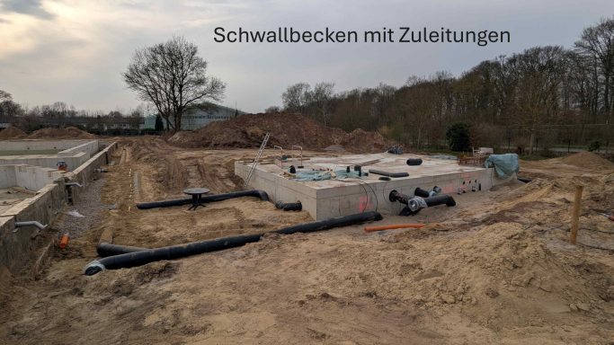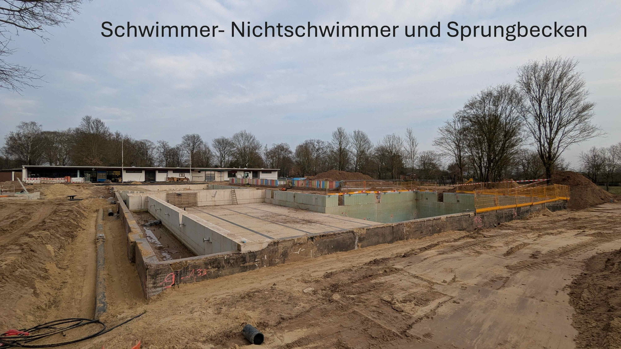 Mit Fotos belegt er den aktuellen Stand. Das Mehrzweckbecken ist gut vorbereitet. Beim Kinderbecken ist der Grund schon gelegt worden, sodass das Edelstahlbecken aufgestellt werden kann. Der große Schwallwasserbehälter zur Reinigung des Wassers ist fertig. Der Technikraum mit den Wasserfiltern fürs Abwasser ist zu 95% fertig gestellt.